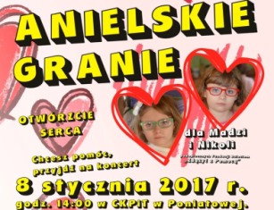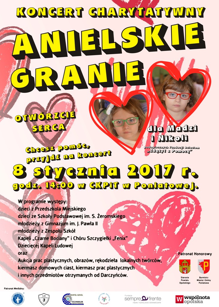 Zapraszamy Koncert odbędzie się 8.01.2017 r. o godzinie 14:00 w CKPiT w Poniatowej. Zebrane fundusze podczas koncertu zostaną przekazane na rzecz bliźniaczek Magdaleny i Nikoli Pastwa z Poniatowej, podopiecznych Fundacji Dzieciom „Zdążyć z Pomocą”.