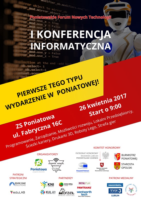 Konferencja odbędzie się 26 kwietnia 2017 w Zespole Szkół w Poniatowej, w godzinach od 8:30 do 14:00. Skierowana jest ona do uczniów szkół gimnazjalnych i średnich z naszego regionu. Na nasze zaproszenie pozytywnie odpowiedziały wszystkie gimnazja i szkoły średnie z powiatu opolskiego. Spodziewamy sie około 130 uczniów zainteresowanych informatyką i nowymi technologiami.